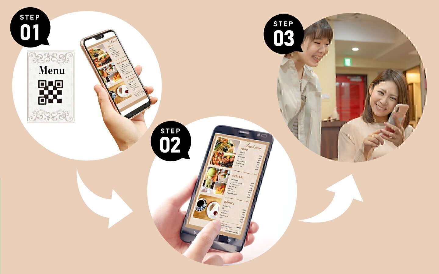 お客様は自身のスマホやタブレットを使いQRコードからメニュー情報にアクセス。
